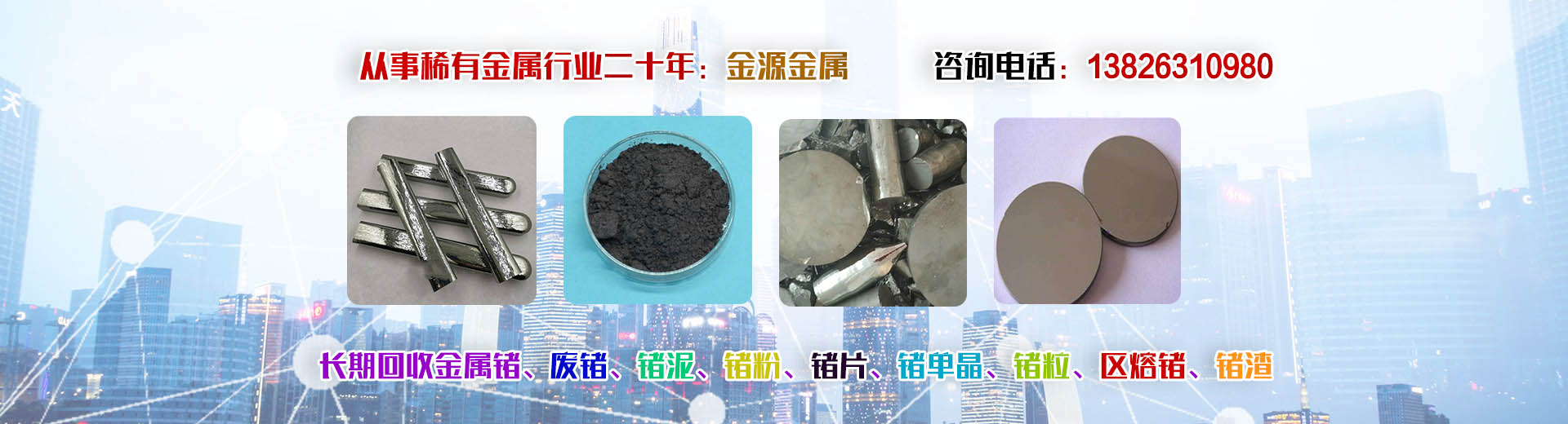 韶關(guān)市金源金屬材料有限公司坐落于中國(guó)廣東省韶關(guān)市,長(zhǎng)期收購(gòu)回收銦、精銦、粗銦、銦絲、銦靶材、ITO靶材靶粉、回收金屬鍺、鍺錠、鍺粉、鍺片、回收鍺單晶、單晶鍺、鍺粒、區(qū)熔鍺、工業(yè)鍺、廢鍺、鍺泥、鍺渣、二氧化鍺回收、四氯化鍺、有機(jī)鍺、銀、純銀、銀靶材、高價(jià)收購(gòu)回收ITO廢靶、回收廢銦、廢銦沙、廢銦渣、回收粗銦、廢銦絲、廢銦珠、廢銦箔、廢銦棒、收購(gòu)銀焊條、銀焊絲、導(dǎo)電銀膠、金屬鎵、硝酸鎵、氧化鎵、三氯化鎵、氯化鎵,供應(yīng)及回收氧化鎵、氫氧化鎵、碲化鎵,硒化鎵,銦粉,氧化銦、氯化銦、硫酸銦、硫化銦、醋酸銦、氫氧化銦、硒化銦,碘化銦,銅銦鎵硒,含金、銀、銦、銠、鈀、鎵、鍺等稀有貴金屬材料,稀土金屬材料、氧化鏑、氧化镥、氧化鋱、氧化鐠釹等回收。